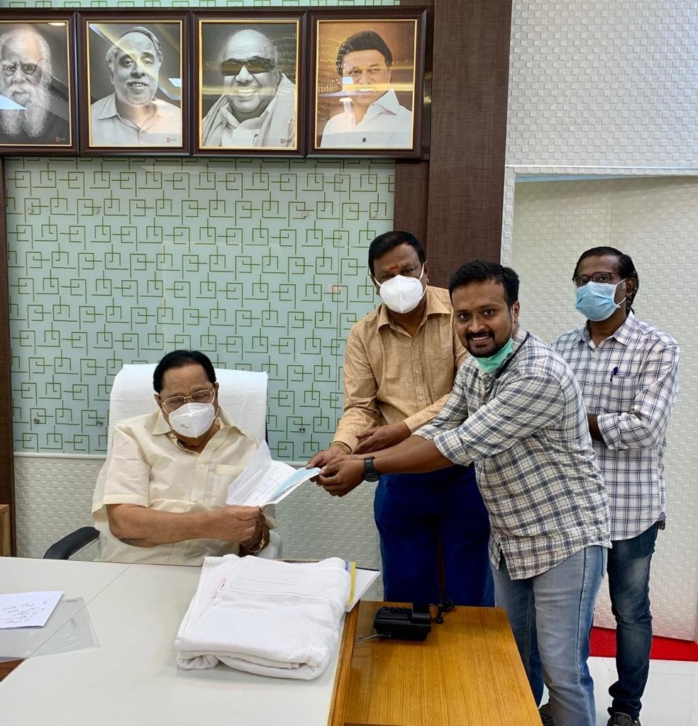 மாண்புமிகு தமிழக முதல்வர் கோவிட் 19 நிவாரண நிதிக்கு தமிழ்நாடு வரைவாளர் சங்கத்தின் சார்பில் உறுப்பினர்களிடமிருந்து நன்கொடையாக பெறப்பட்ட ரூபாய் 5,00,000/ தொகைக் கான காசோலையை மாண்புமிகு நீர்வளத்துறை அமைச்சர் திரு .துரை முருகன் அவர்களிடம் மாநில தலைவர் திரு ஆர் .பெருமாள் பிள்ளை அவர்களால் பொது செயலாளர் திரு எஸ் .கே .கலைச்செல்வன் மற்றும் மாநில பொருளாளர் திரு ஜி .சிவராமன் ஆகியோர் முன்னிலையில் 23.07.2021 அன்று வழங்க பட்டது .உடன் தலைமை இடத்து செயலாளர் திரு .மோகன்