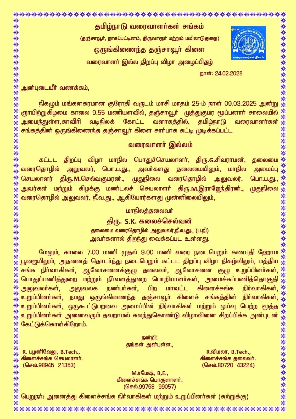 12.03.2025 அன்று காலை 9.55 மணியளவில் திறப்புவிழா மிகச்சிறப்பாக நடைபெற்றது. வரைவாளர் இல்ல கட்டடம் கட்ட ஒத்துழைப்பு மற்றும் நிதி உதவி வழங்கி சிறப்பித்த அனைத்து நல்உள்ளங்களுக்கும், விழாவில் கலந்து கொண்டு சிறப்பித்த அனைவருக்கும் தமிழ்நாடு வரைவாளர்கள் சங்கத்தின், ஒருங்கிணைந்த சேலம் கிளைச்சங்கம் சார்பில் மனமார்ந்த நன்றியினை தெரிவித்துக்கொள்கிறோம்